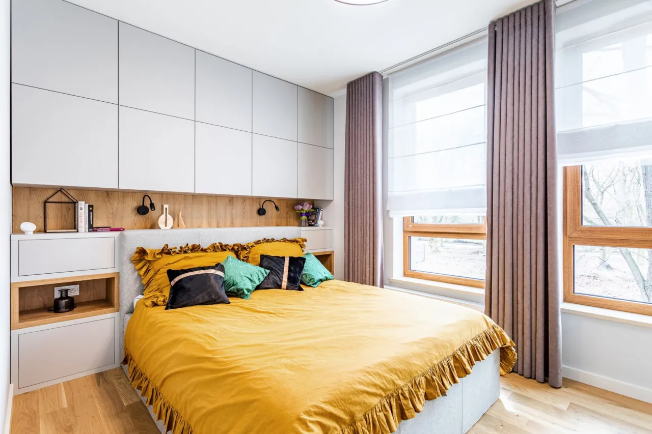 Naturalne światło to najlepszy sprzymierzeniec w aranżacji sypialni w bloku. Duże okna bez ciężkich zasłon pozwalają światłu swobodnie wpadać do wnętrza. Jasne, przejrzyste firanki lub rolety zamiast grubych zasłon to dobry wybór dla małych pomieszczeń.